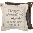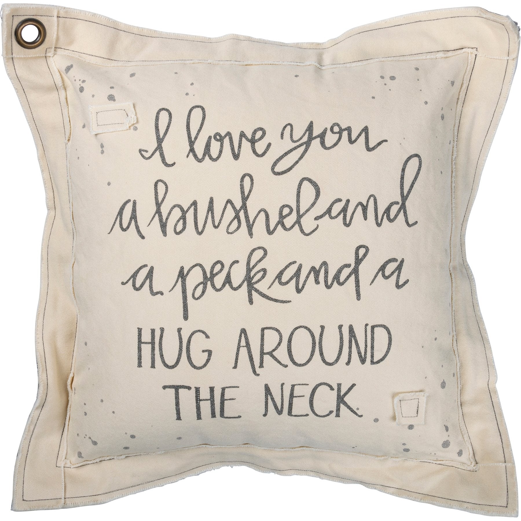A double-sided canvas pillow featuring hand-lettered "I Love You A Bushel And A Peck And A Hug Around The Neck" sentiment with patches and paint splatter details on front, and complementing color on back. Features metal grommet in corner for added interest. Polyester filling. Includes zipper to easily remove and clean cover.