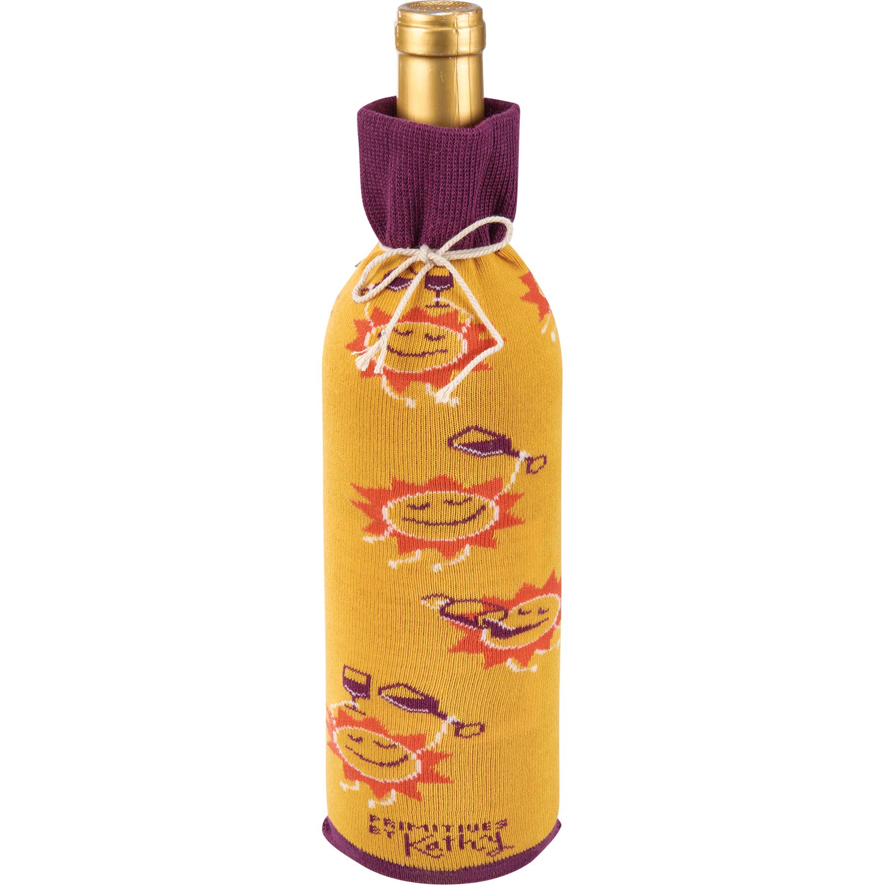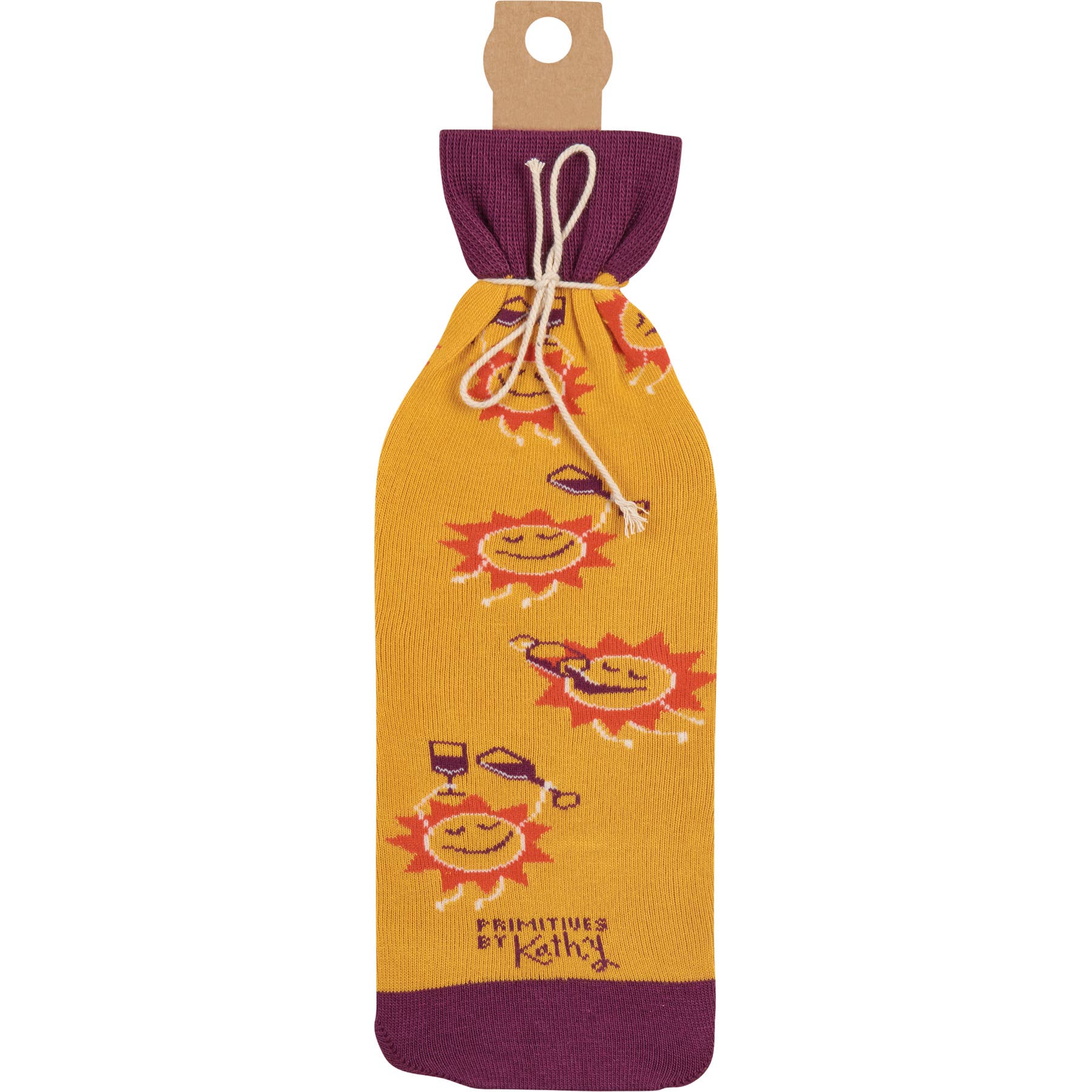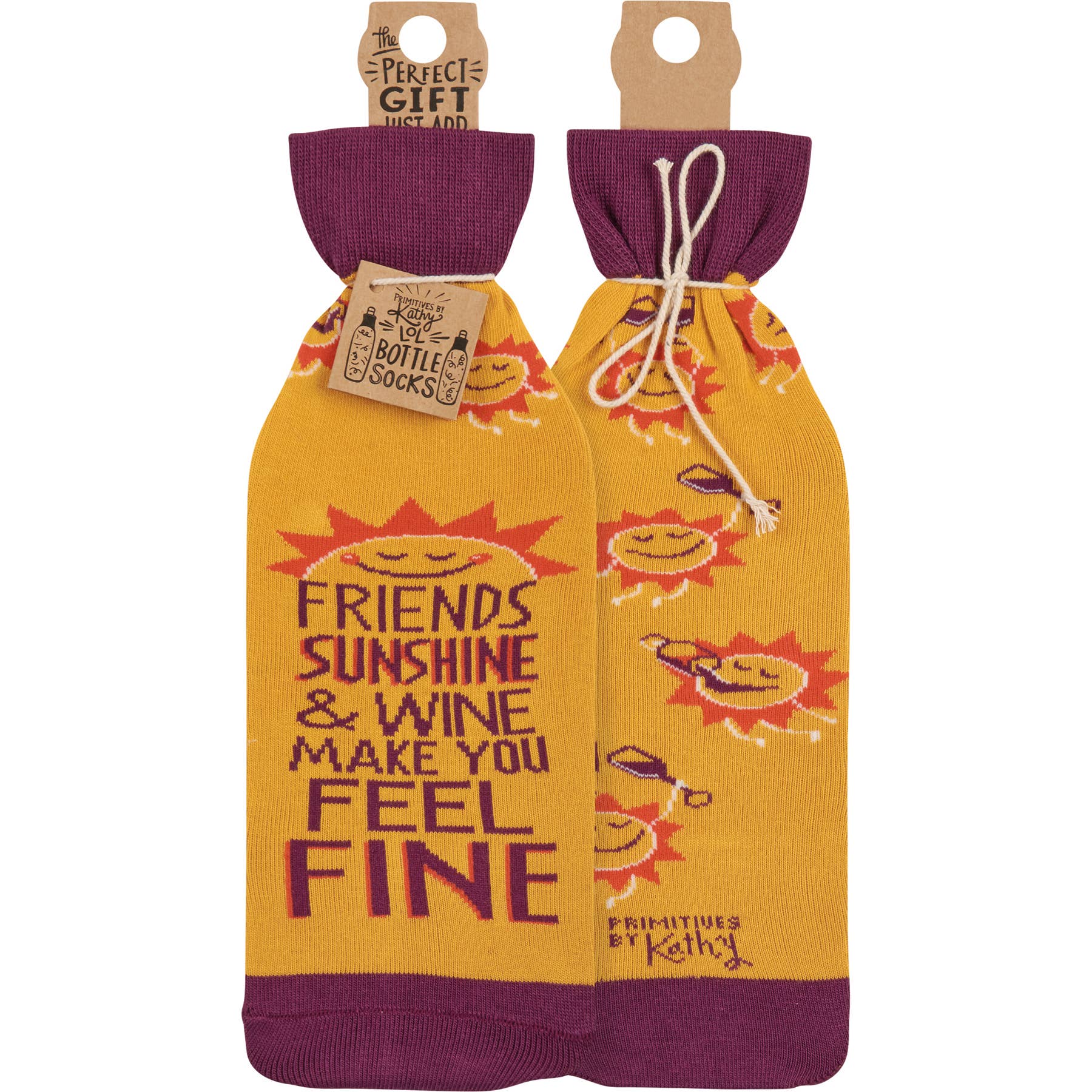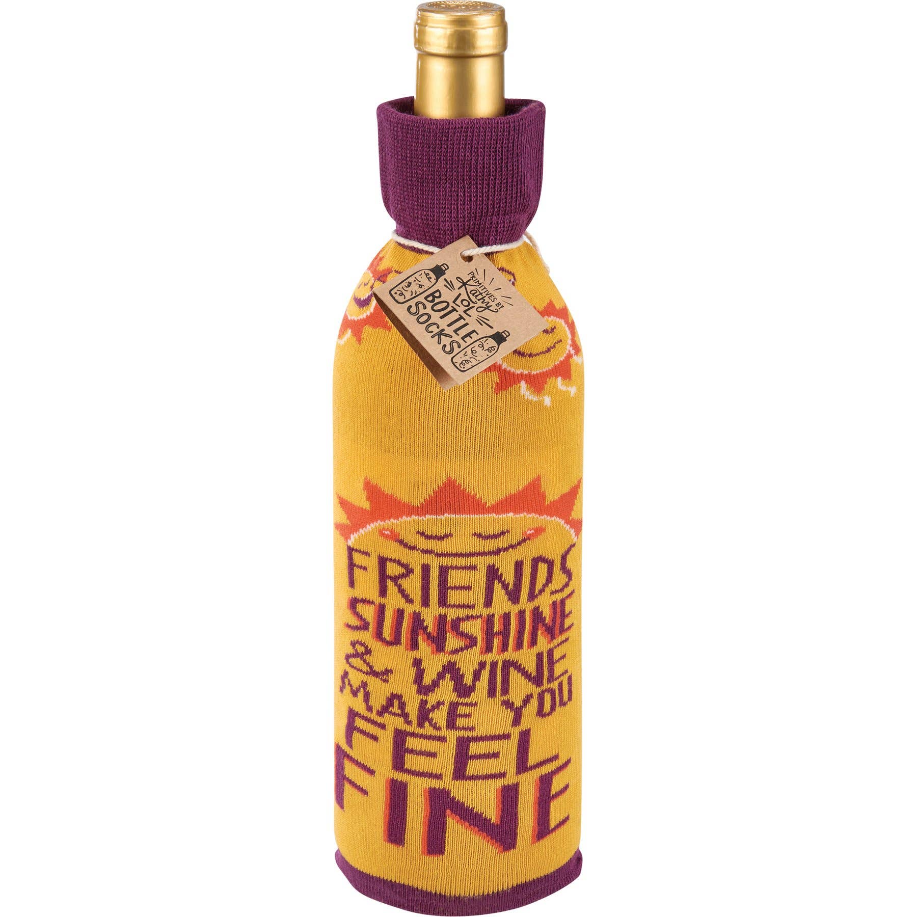 A creative alternative for a traditional gift bag, this washable and re-useable knit bottle sock displays a humorous "Friends Sunshine & Wine Make You Feel Fine" sentiment and full wrap-around design of suns drinking wine. Packaging includes a kraft paper hangtag that can be used as a gift tag. Sock is made with a blend of cotton, nylon, and spandex to fit bottles around 750 mL to 1.5 liters.