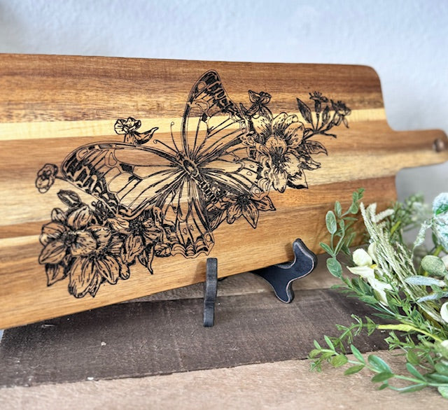 These acacia wood cutting boards are custom etched/engraved on our laser machine with this beautiful design. Each one is then cleaned and treated with hemp oil which is food-grade safe. Hemp oil keeps the board conditioned and looking beautiful. If you do not want to use the etched/engraved side, simply flip over and use the back side.