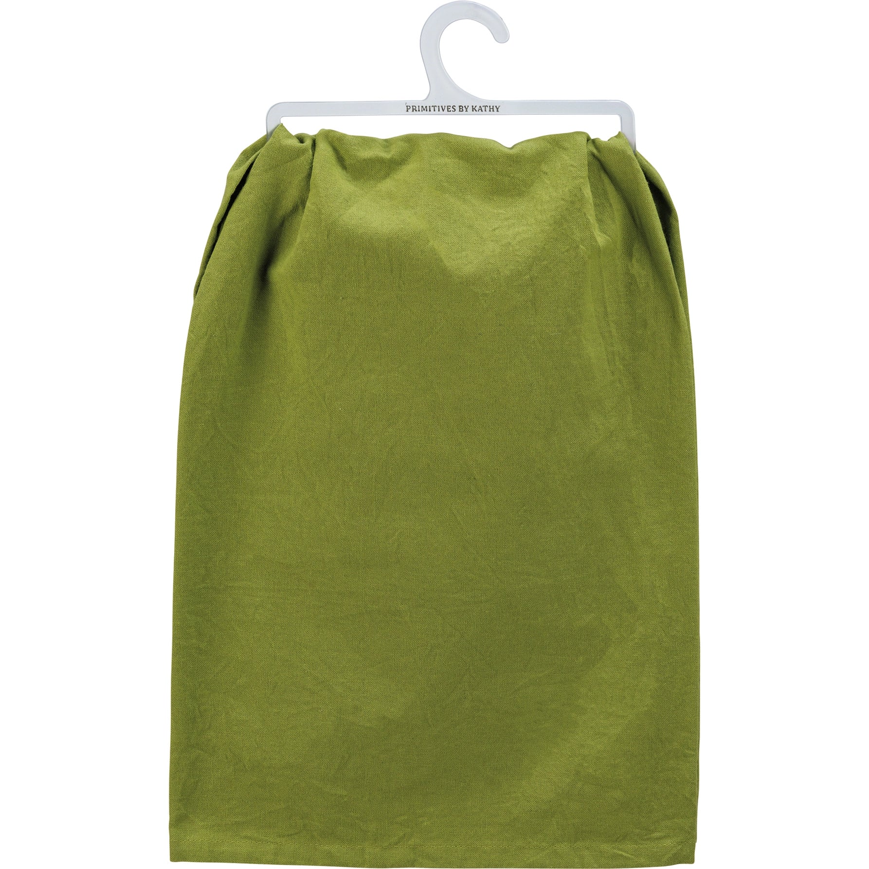 A cotton kitchen towel featuring a "Your Spray Bottle Doesn't Scare Me" sentiment with kitchen scene illustration and cat design.