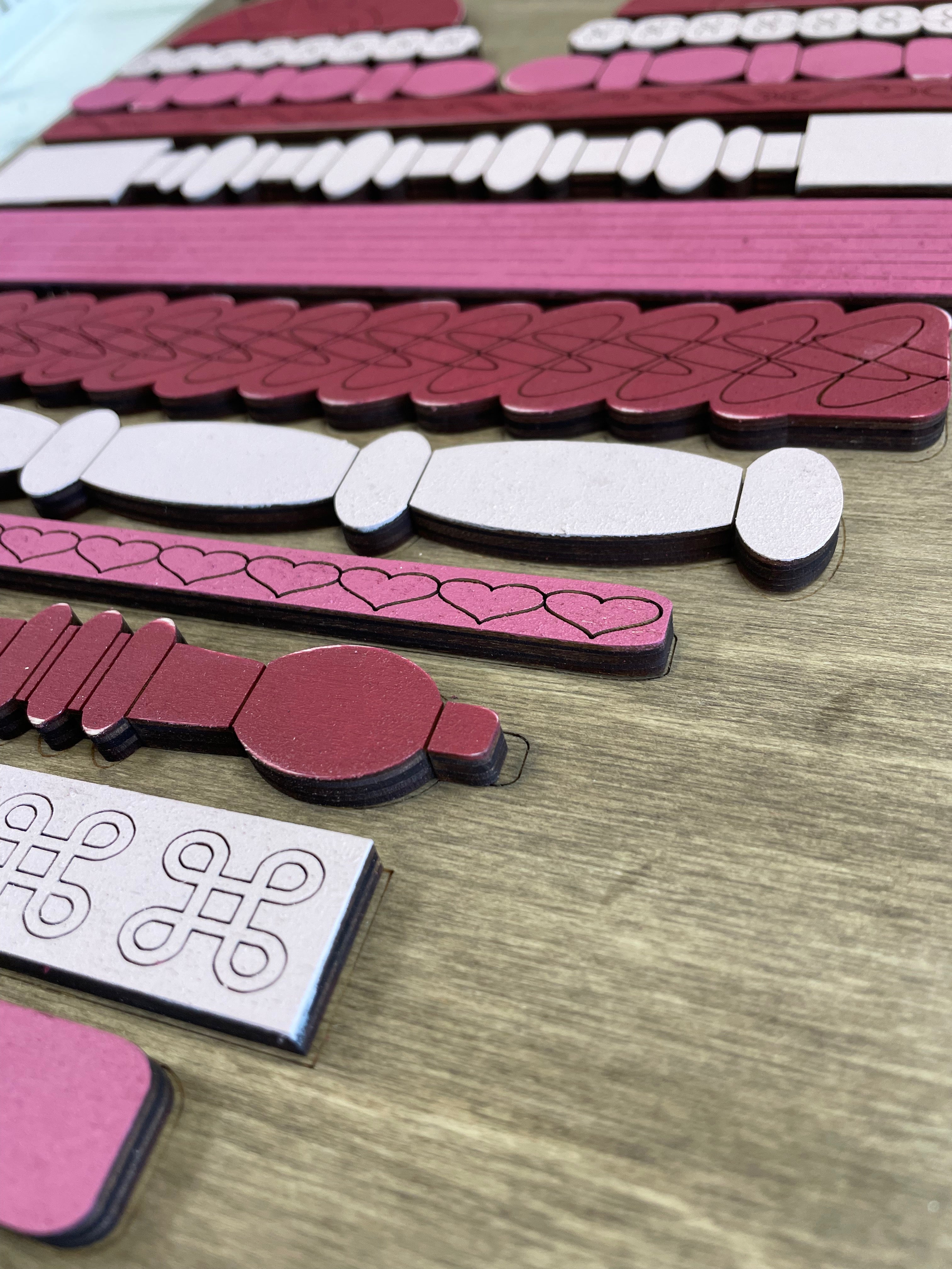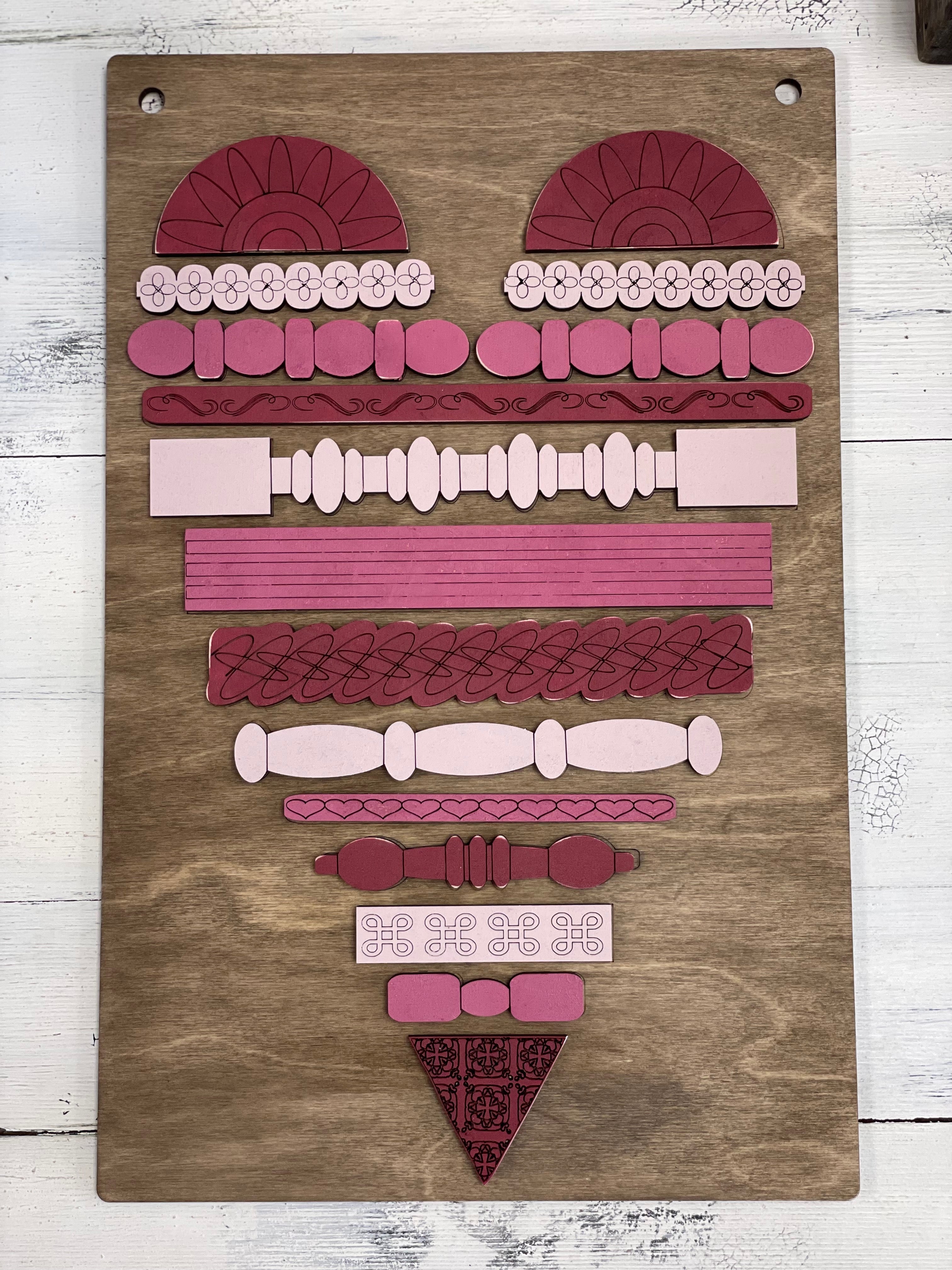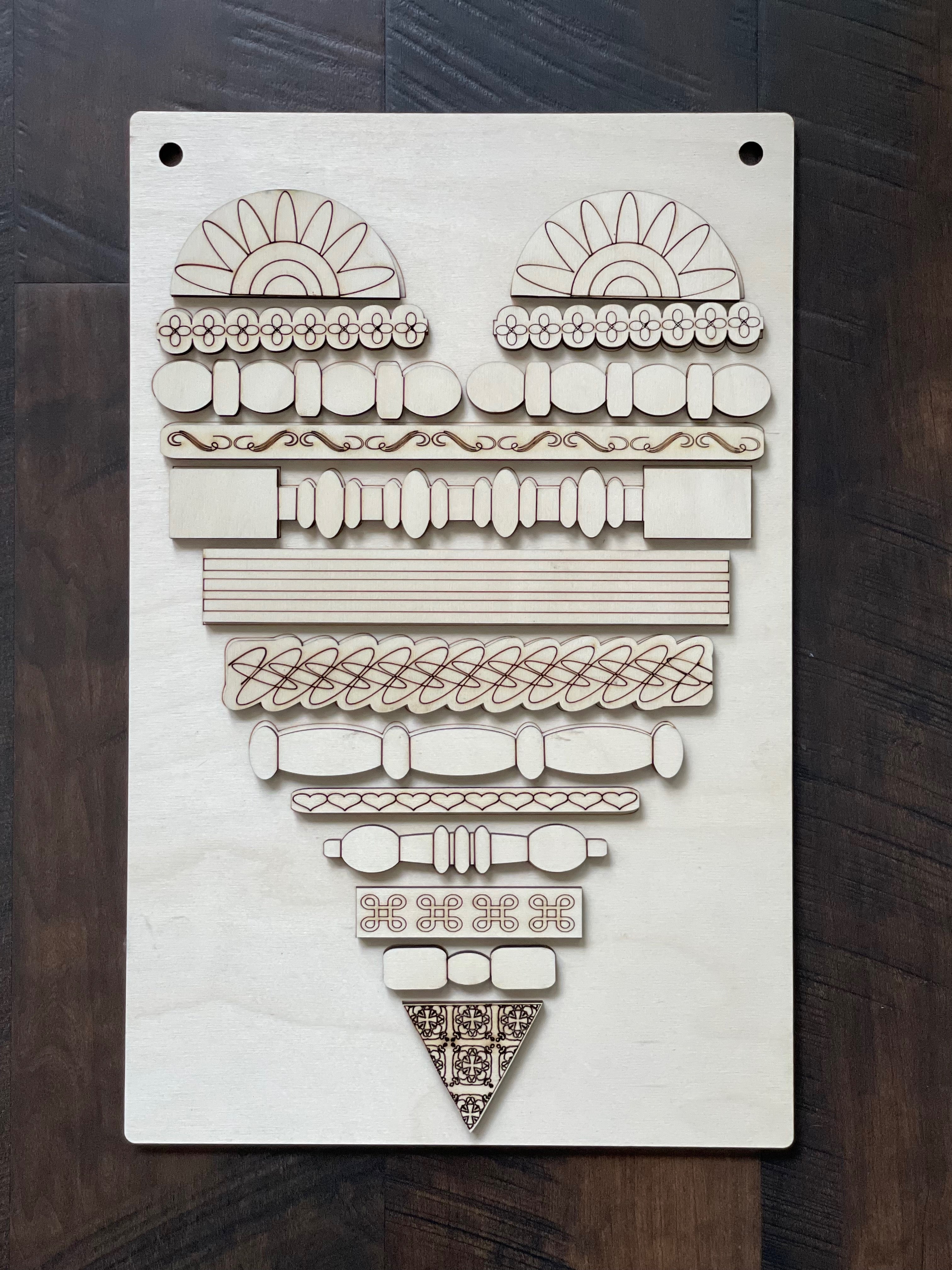 Unfinished, unassembled precut laser wood cutout. Each layer is approximately 0.25" deep. Laser cutters will produce a burned edge on the cutout pieces. This is normal. They can be left as is or easily painted.