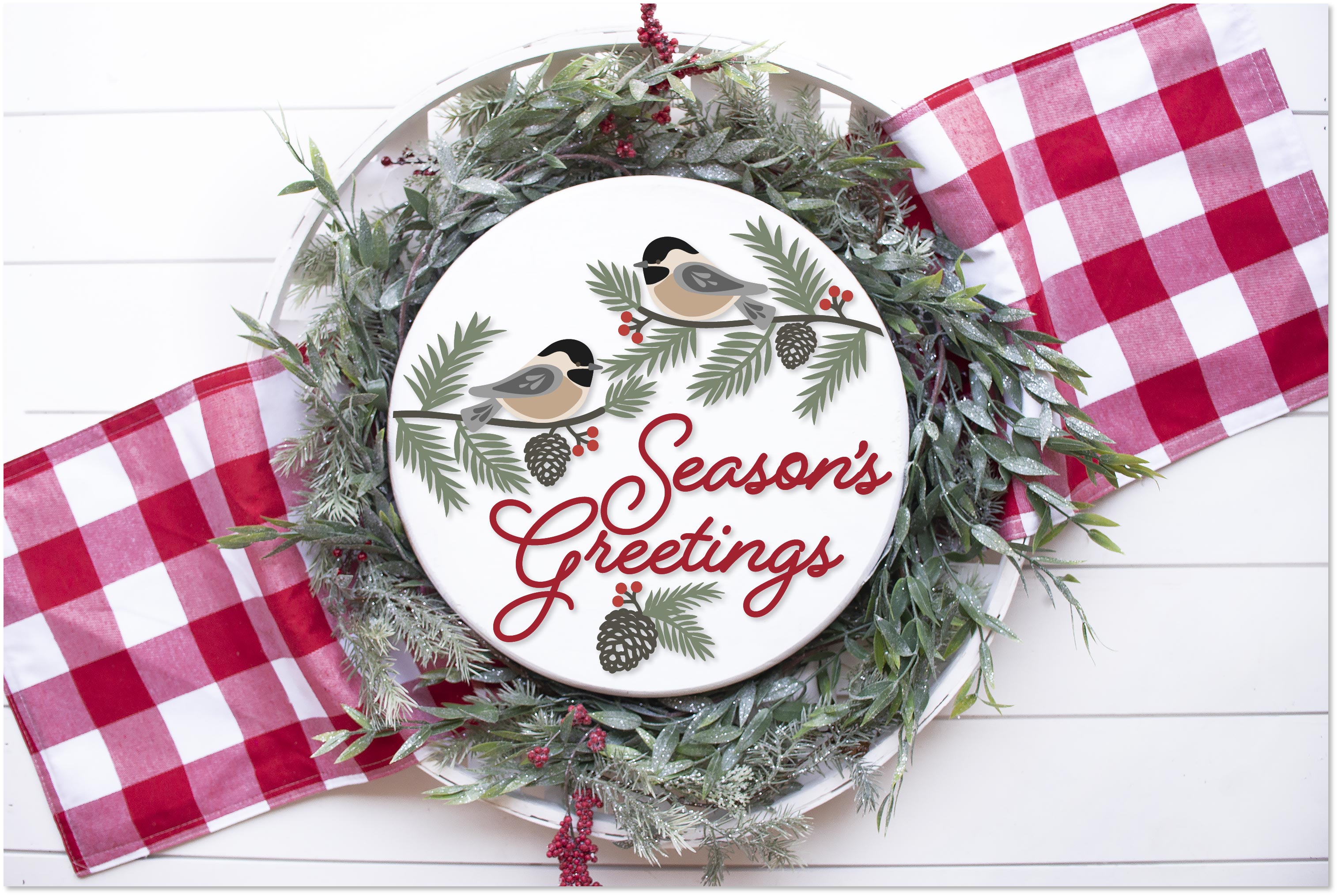 This 15" Door Hanger kit is an unfinished paint it yourself kit.  All pieces come unfinished/unpainted and will need to be glued.  You can finish with paint and/or stain to your desired look.  You get to choose the words "Winter Welcome or Seasons Greetings"
