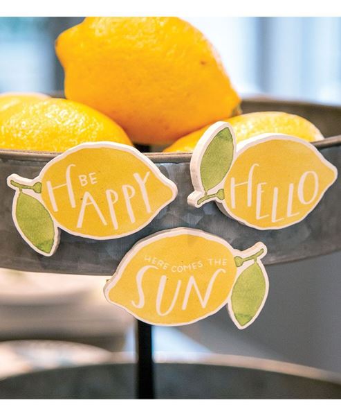 Add a little happiness to a variety of settings with the Be Happy Lemon Magnet set. These cute, wooden magnets feature yellow, watercolor style lemons with green stems and leaves. White text reads "Hello" on one, "Be Happy" on another, and "Here comes the Sun" on the third. These magnets will add a fun pop of color and warmth to a variety of metal surfaces such as milk cans, tiered trays, metal doors, and more!"