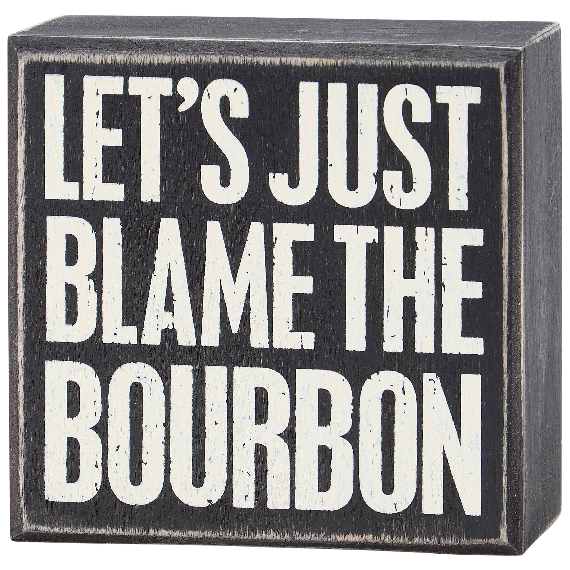 A classic black and white wooden box sign displaying a humorous alcohol inspired sentiment that reads "Let's Just Blame The Bourbon." Funny box sign features distressed details with coordinating black color on sides and back.