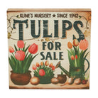 Spring In Bloom Tulips For Sale MDF Block Sign, a charming piece that captures the essence of a classic spring market. This 8x8-inch square sign features the text "Kline's Nursery Since 1942, Tulips for Sale" in rich green, offering a nostalgic touch reminiscent of old-fashioned market signs. The design is completed with a delightful image of a planter and watering pitcher overflowing with vibrant tulips in pink and yellow.
