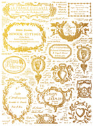 A sophisticated European gilded transfer collection, Étiquettes is perfect for goth-glam styles and seamlessly integrates into French farmhouse aesthetics when used on neutral colors and softened with a patina or slight antiquing. This collection features elegant labels and signage with flourished frames, intricate typography, and motifs reminiscent of 18th and 19th-century decorative art. Laurel wreaths, floral motifs, and frames inspired by 1800s calling cards add to its timeless charm. Use individual elements on your small projects, or apply the whole sheet as an all-over pattern.