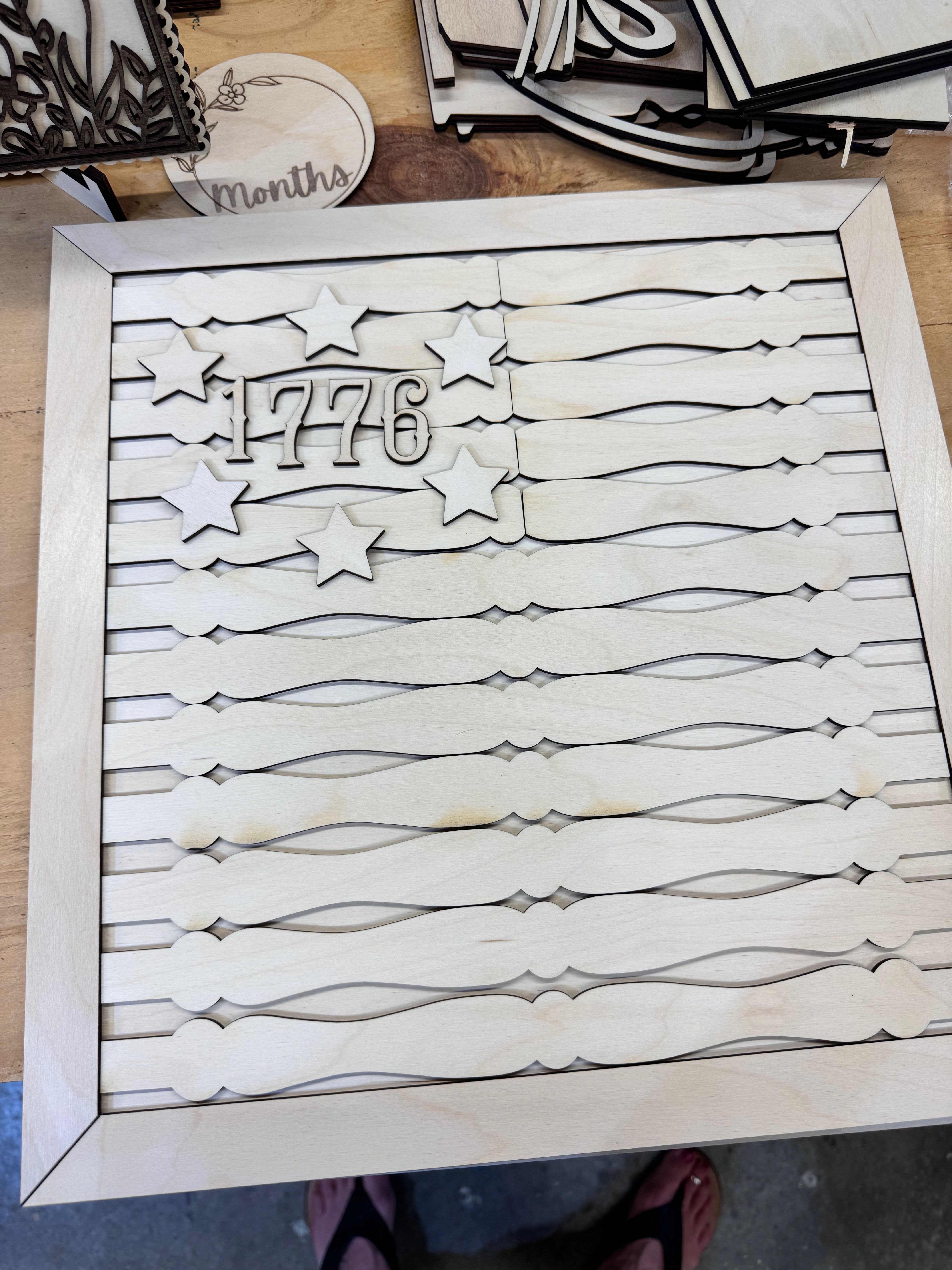 This 15x15 wood sign is an unfinished paint it yourself kit. All pieces come unfinished/unpainted and will need to be glued. You can finish with paint and/or stain to your desired look. Add your own ribbon if you choose.