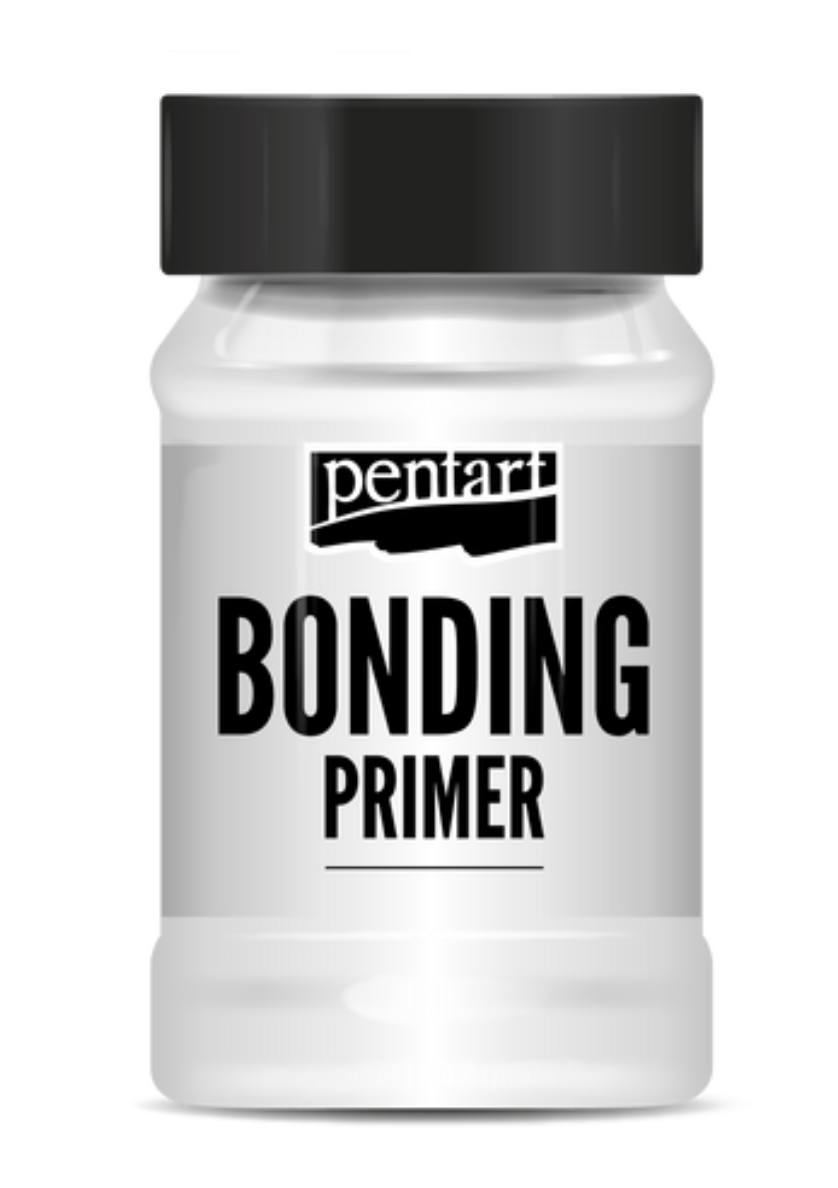 Water-based primer suitable to apply on surfaces difficult to paint, provides a strong bond between the surface and the coating layer. Use on surfaces such as: laminated furniture, wood, glass, glazed ceramic, tile, plastic, enamel, aluminium, copper, spelter, steel, iron, corroded metal. Easy to apply and spreads evenly. Can be sanded after it is dried. Any Pentart paint can be applied over the surface covered by the bonding