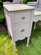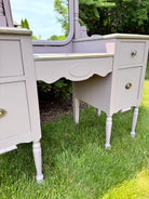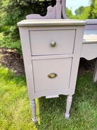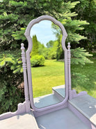 This sweet lil' antique vanity has been given a beautiful makeover. She has been painted in Lavender Haze. Her top has been sanded down and stained in driftwood. All original hardware. Mirror and brackets do easily come off. Original Casters available if you want them.