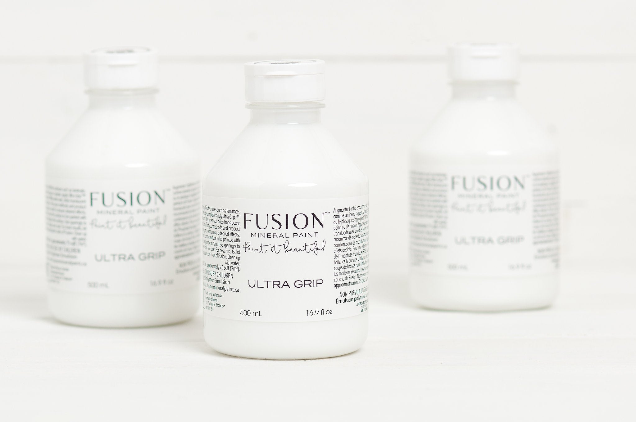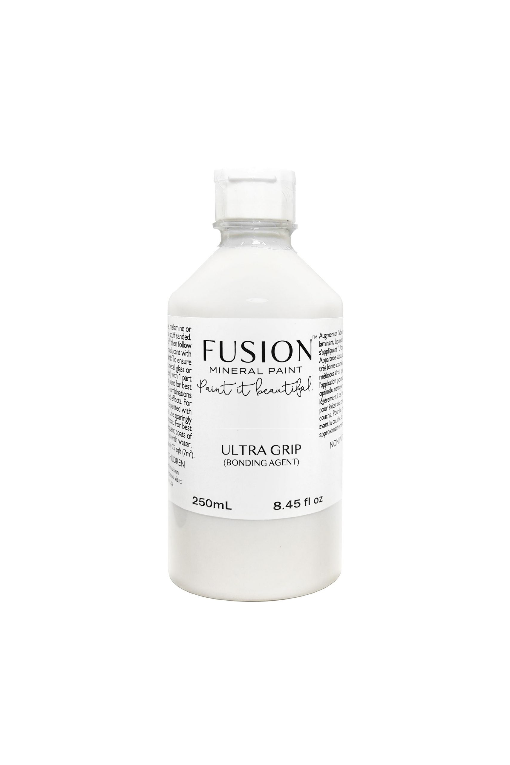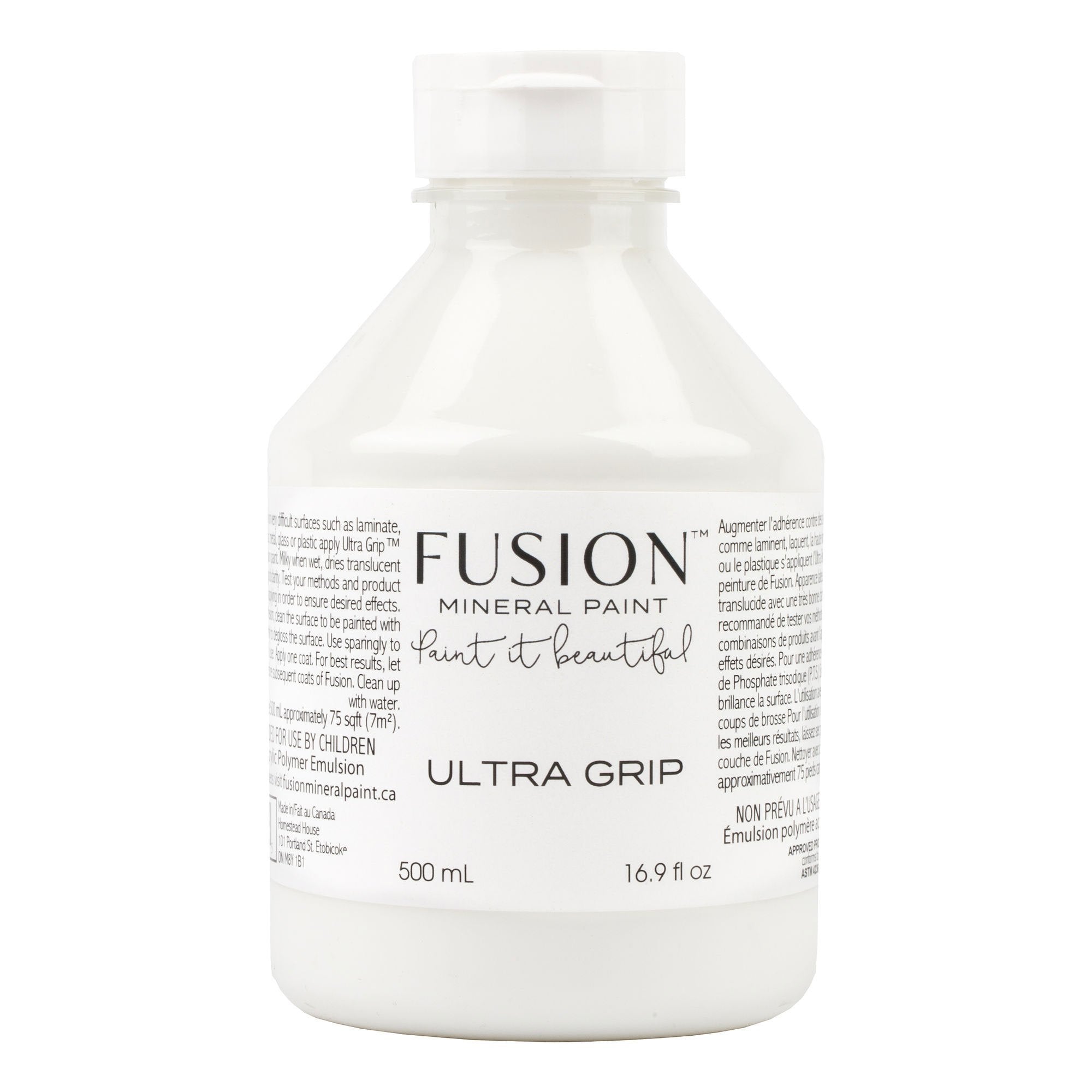 - Ultra Grip Product Description. Some super tricky surfaces require an even stronger adhesion provided by our Fusion Ultra Grip. Laminate, lacquered or high gloss surfaces formerly deemed to be nearly impossible to paint are no longer impossible with the use of our Fusion Ultra Grip. You can even paint metal, glass and even some plastics with it! Made with pure resin, Ultra Grip will adhere much better than paint which contains other ingredients such as pigments and minerals. Ultra Grip is considered an adhesive primer, and allows for Fusion Mineral Paint to adhere to surfaces that are typically not for painting, such as melamine or thermo-foil Fusion adheres well to most clean plastics, metal, and glass without requiring Ultra Grip.