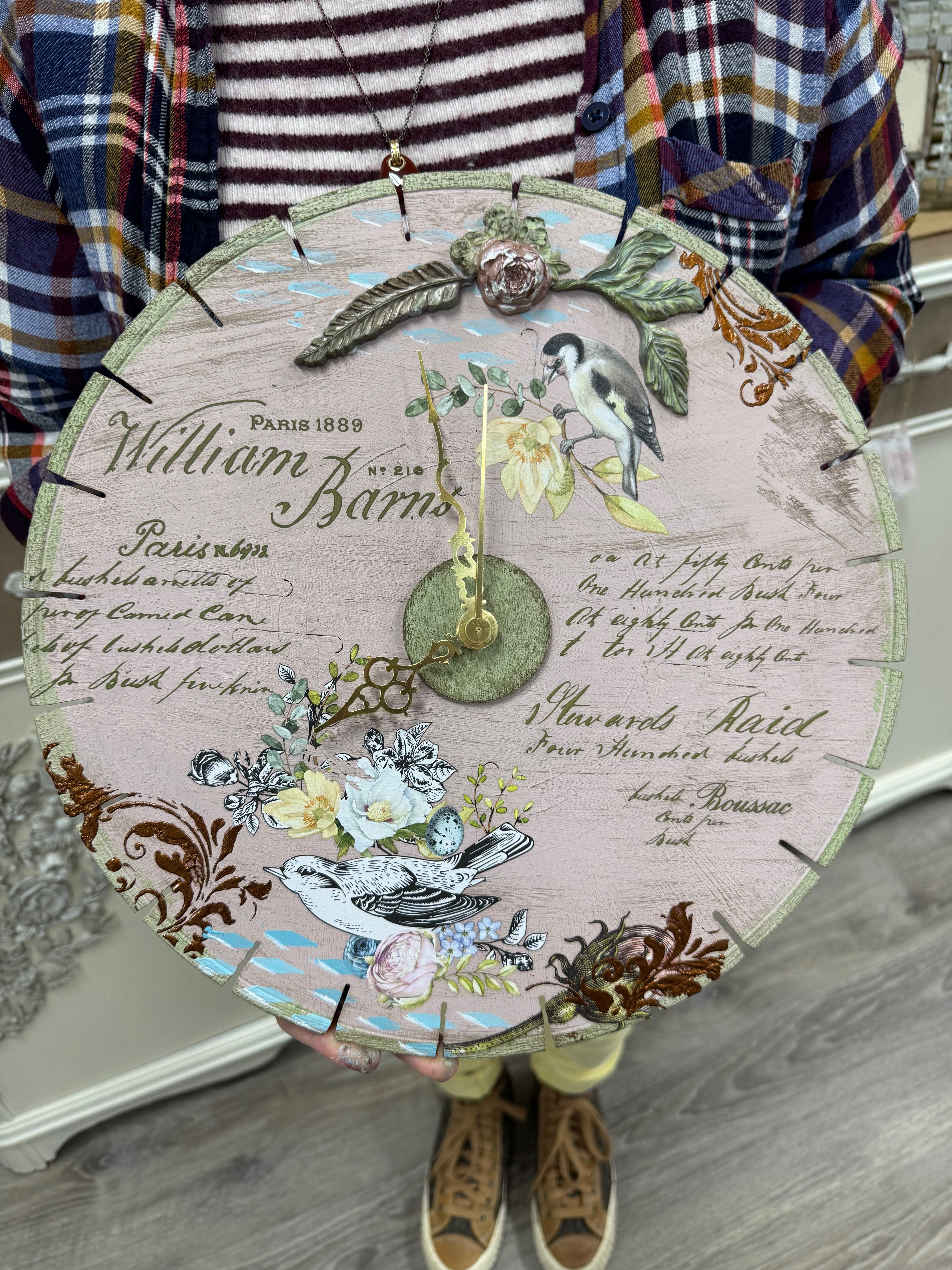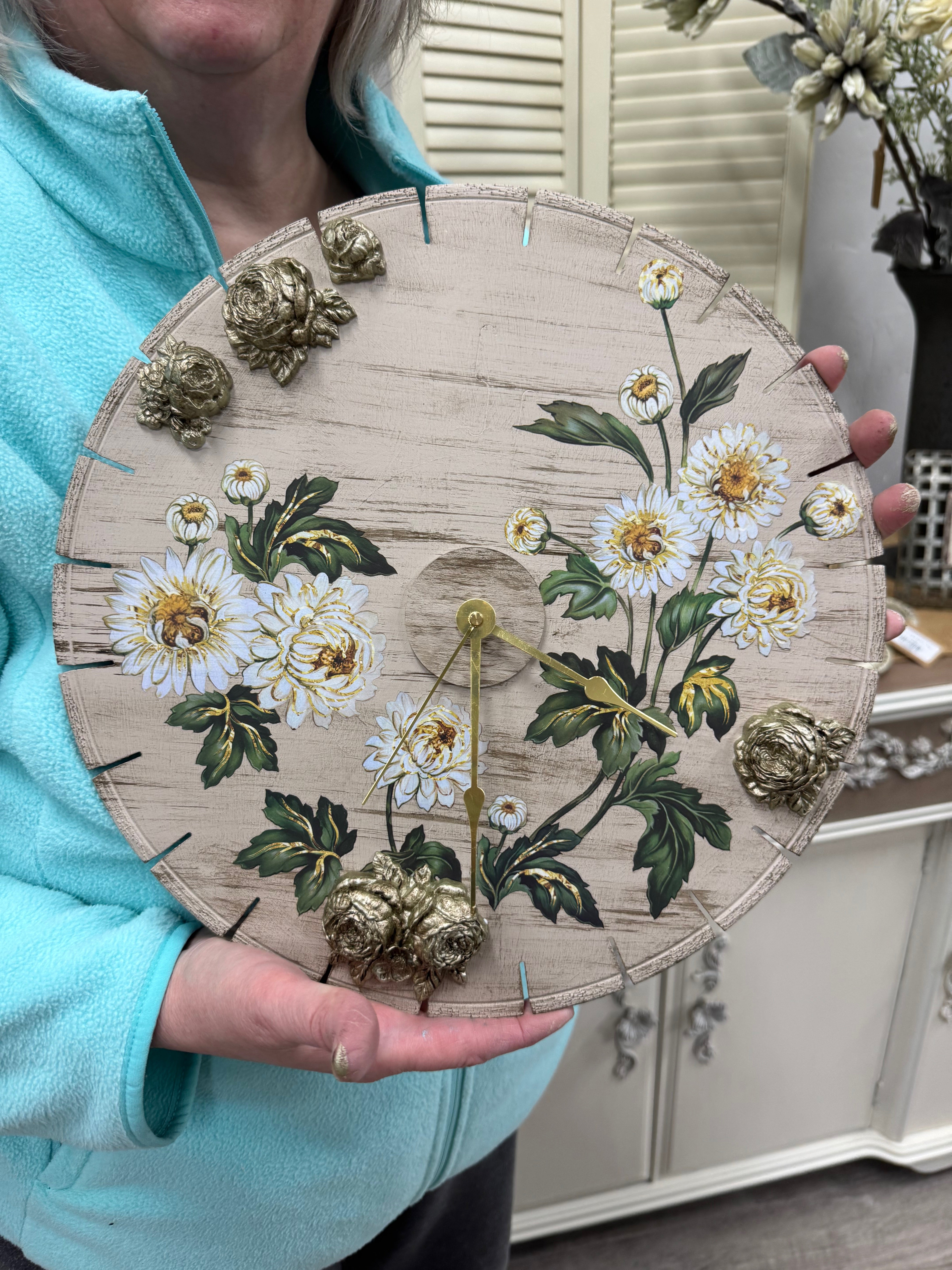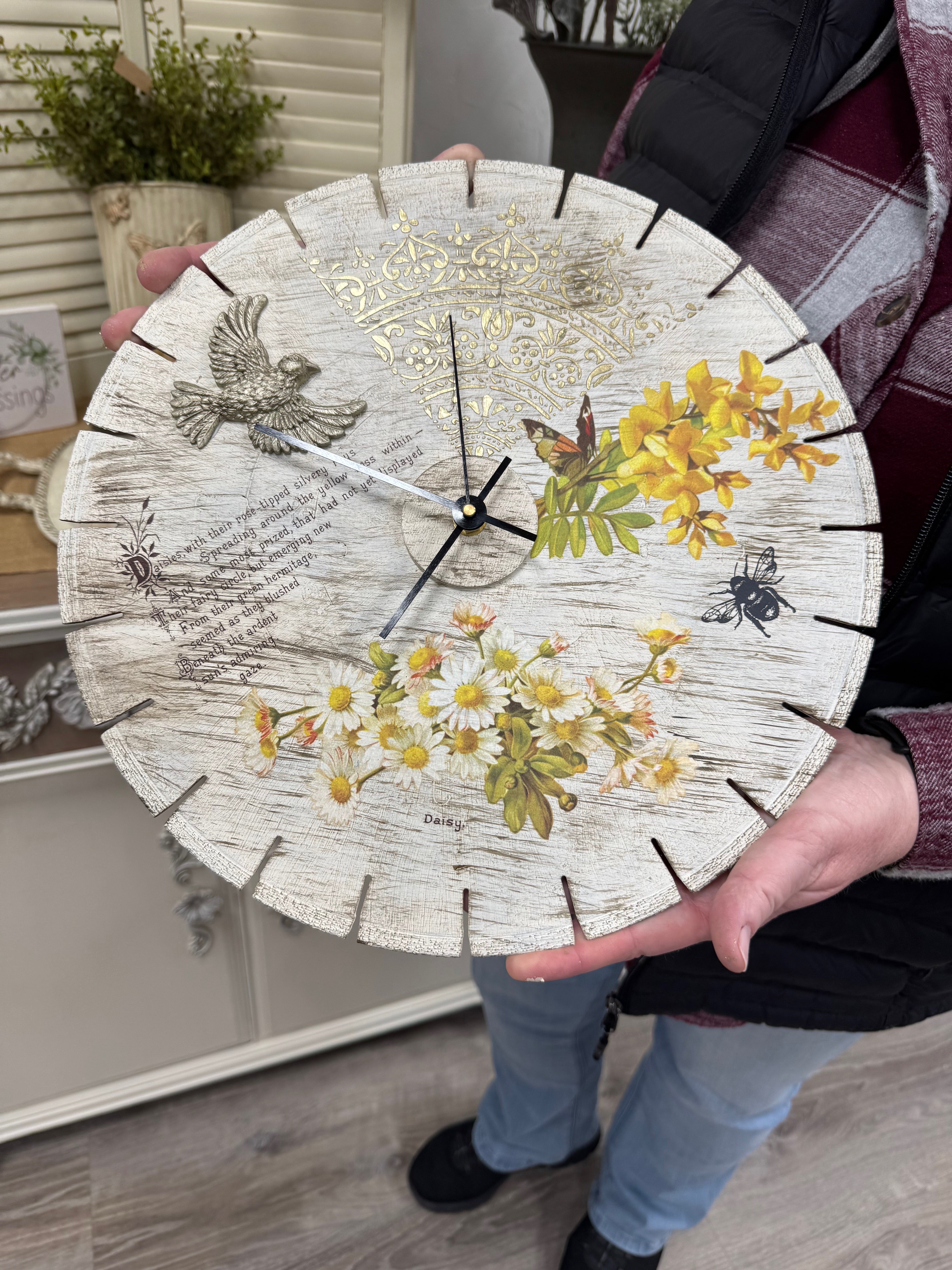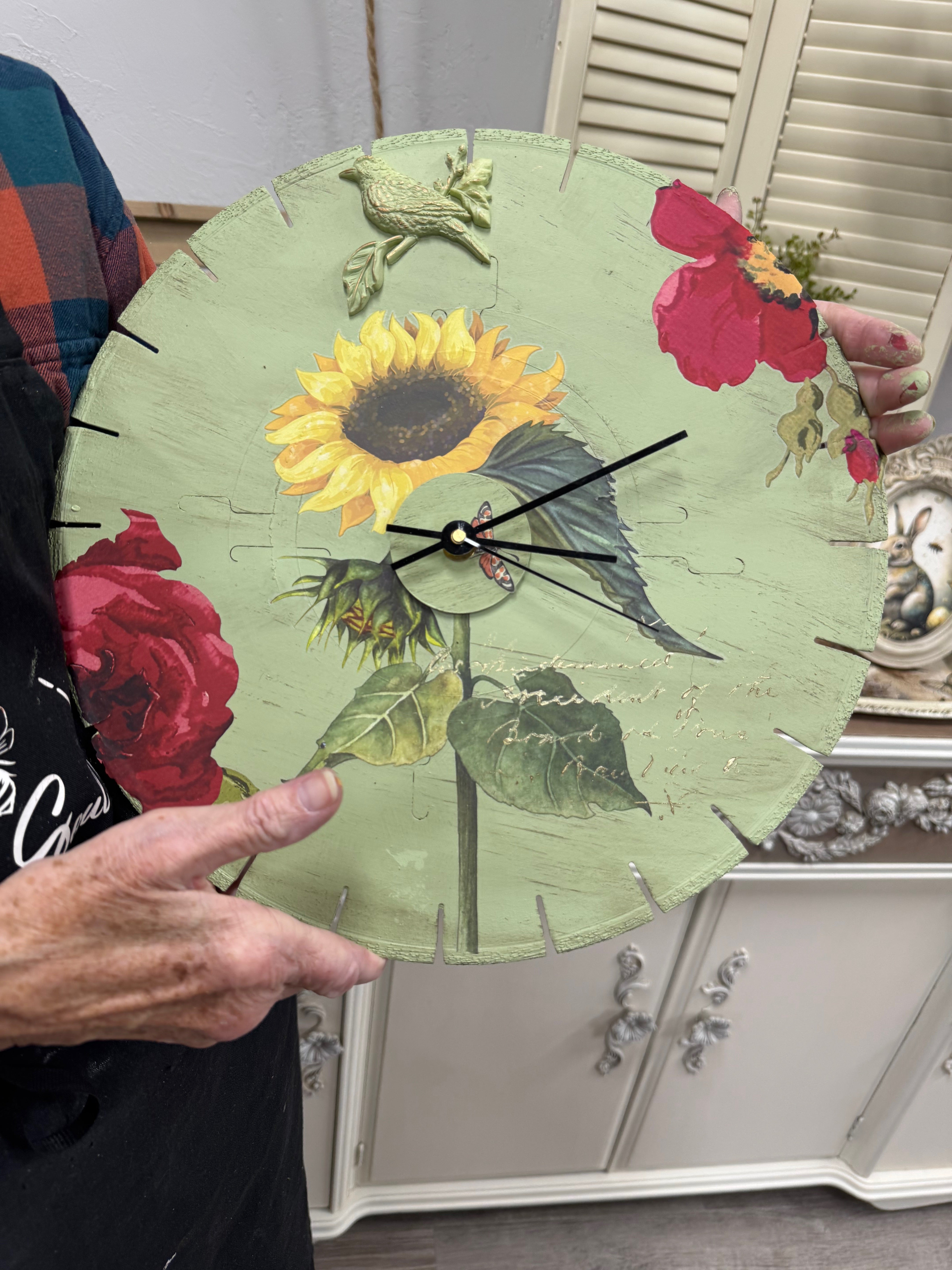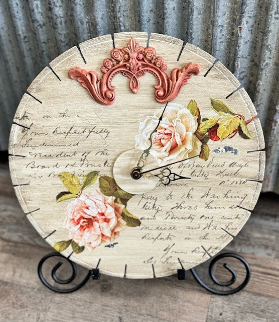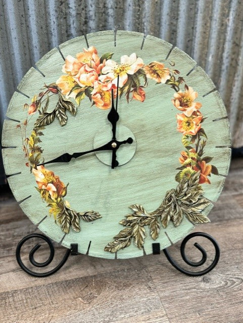 Join Cheryl as she guides you step by step on how to turn a used 13" sawblade into a beautiful clock. You will get to choose from a variety of rub-on transfers & moulds to embellish your clock and make it truly a one of a kind.