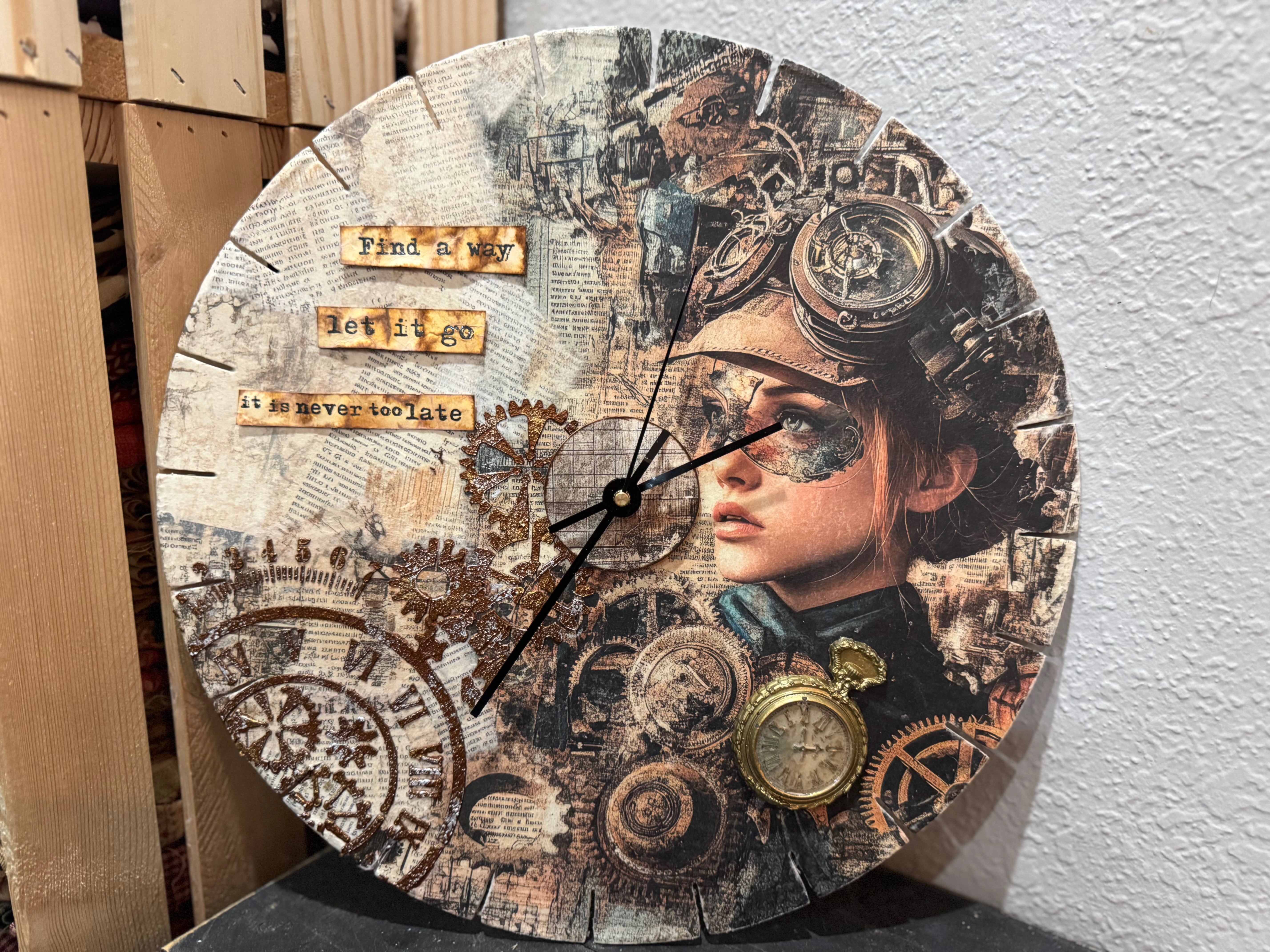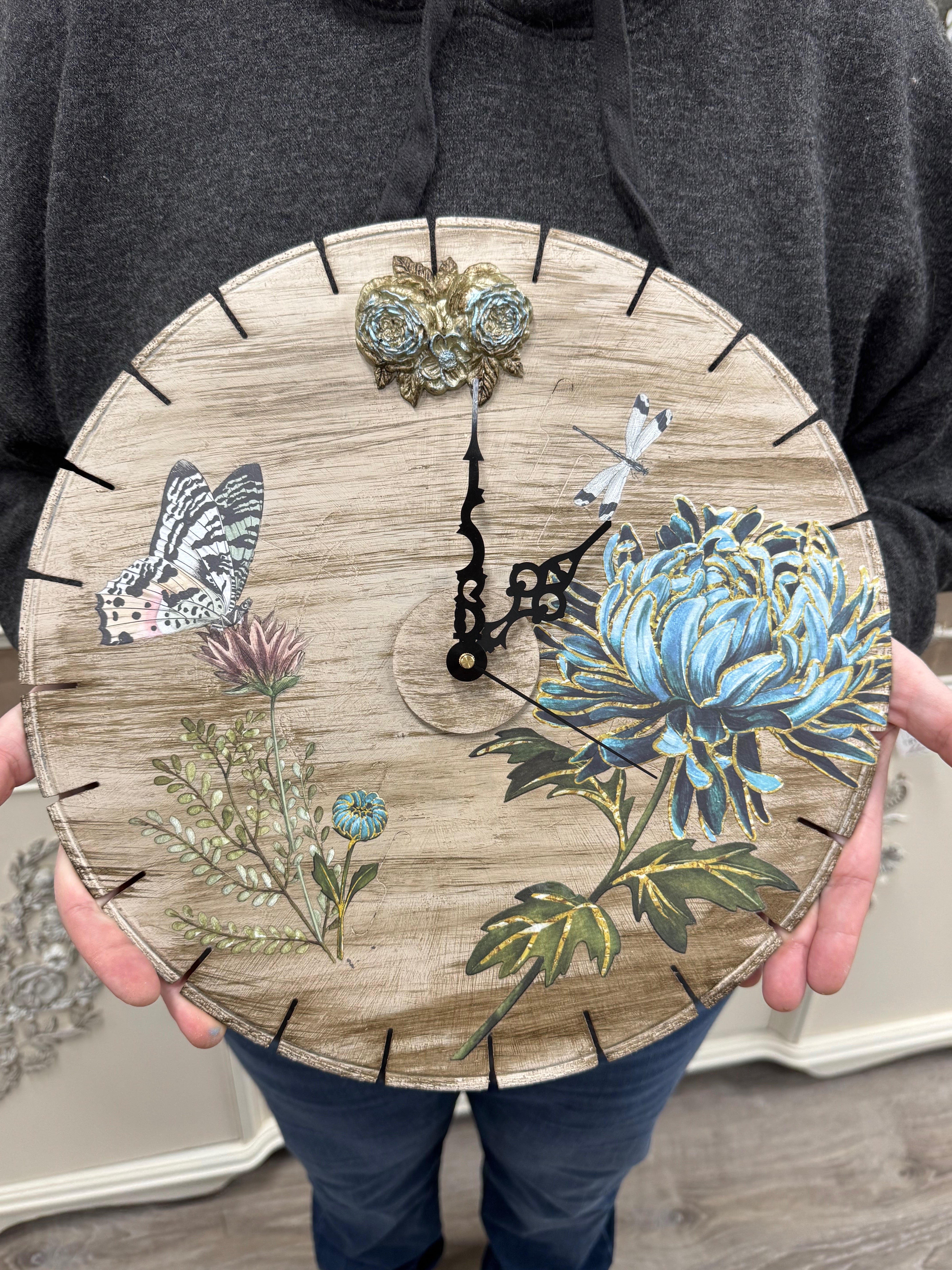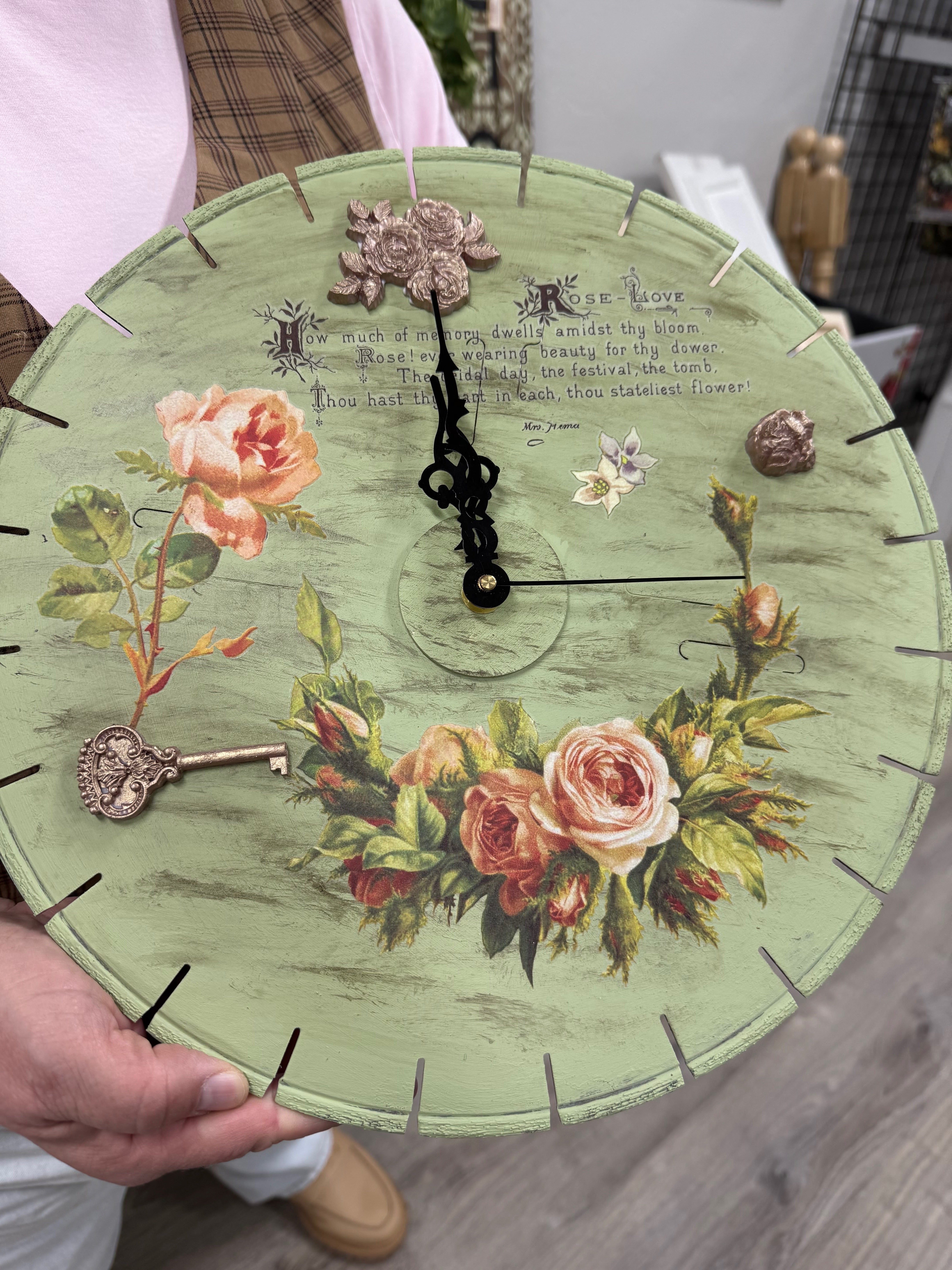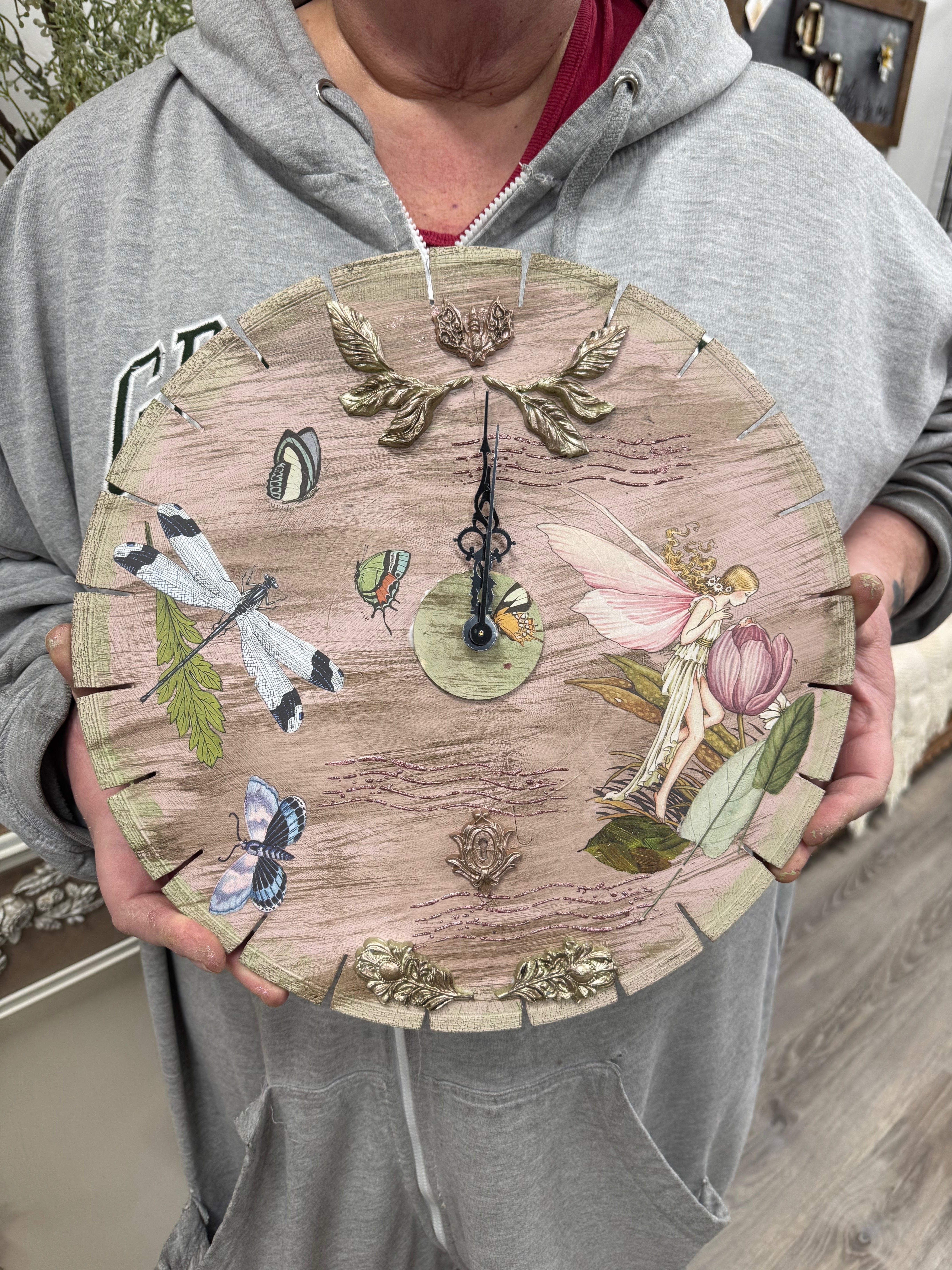 Join Cheryl as she guides you step by step on how to turn a used 13" sawblade into a beautiful clock. You will get to choose from a variety of rub-on transfers & moulds to embellish your clock and make it truly a one of a kind.